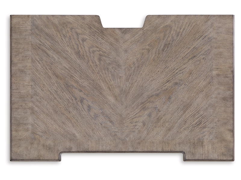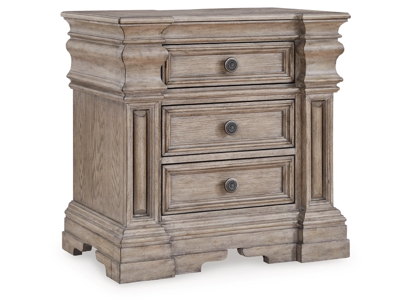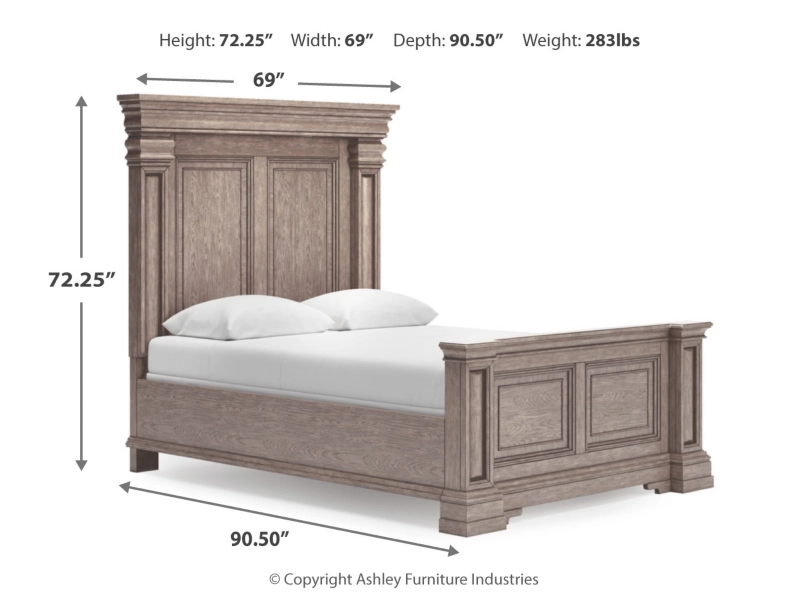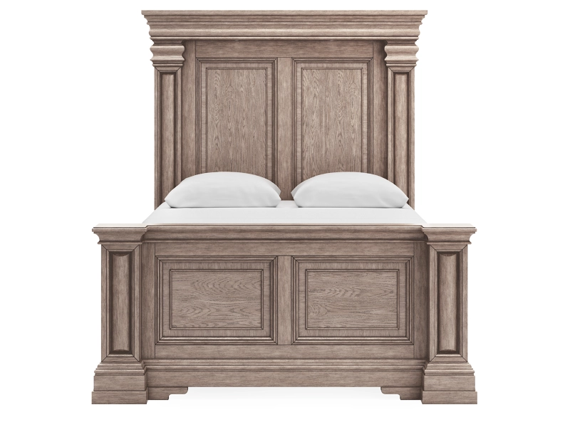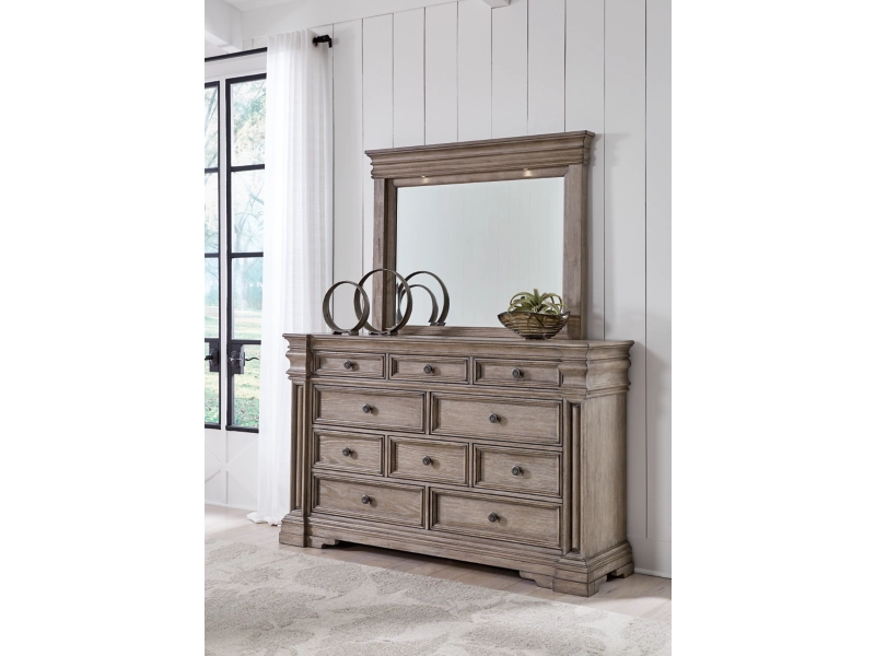 Casual Traditional styling. Made with hardwood solids, Oak and Ash veneer, cast resin components and engineered wood substrates. Light warm grayish brown glazed wood finish. Cases feature break front pilasters, inset framed drawers and inlayed Ash veneer borders on tops. French/English drawer construction with fully finished interiors and metal ball-bearing side glides. Round metal drawer knobs with a satin nickel color finish. B916-57/58 mansion style panel bed features classic decorative pilasters, inset picture framed panels, and an overhead light bridge with 2 LED puck lights for cozy ambient lighting. The three drawer nightstand includes a 110V power supply with dual USB charging ports. Mirror frame features a light bridge with 2 mini LED lights.