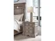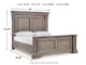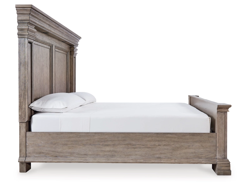 Casual Traditional styling. Made with hardwood solids, Oak and Ash veneer, cast resin components and engineered wood substrates. Light warm grayish brown glazed wood finish. Cases feature break front pilasters, inset framed drawers and inlayed Ash veneer borders on tops. French/English drawer construction with fully finished interiors and metal ball-bearing side glides. Round metal drawer knobs with a satin nickel color finish. B916-57/58 mansion style panel bed features classic decorative pilasters, inset picture framed panels, and an overhead light bridge with 2 LED puck lights for cozy ambient lighting. The three drawer nightstand includes a 110V power supply with dual USB charging ports. Mirror frame features a light bridge with 2 mini LED lights.