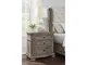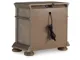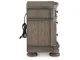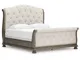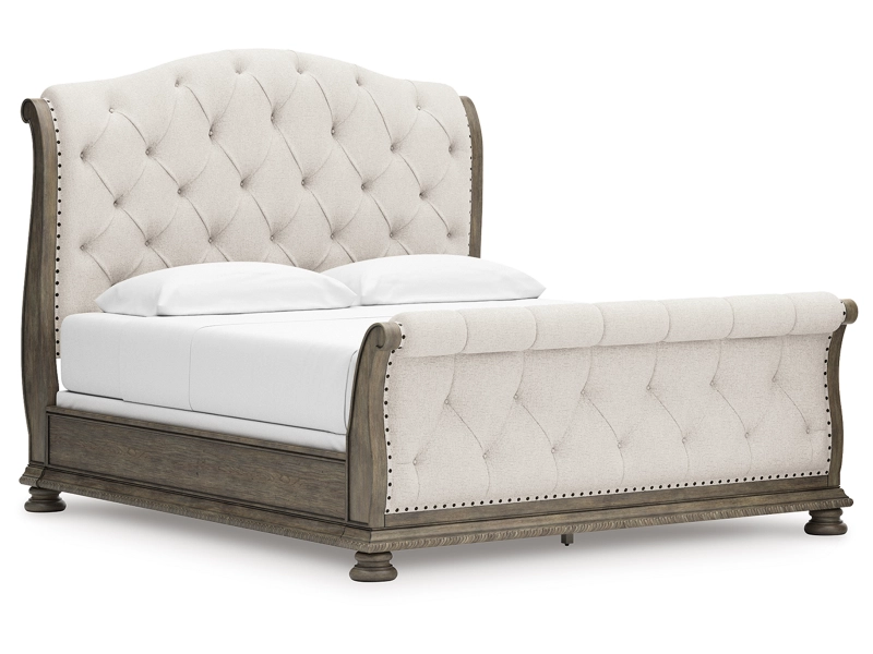 Elegant traditional styling. Made with hardwood solids, Oak and Ash veneer, MDF substrates and cast resin components. A sophisticated light brown finish is artfully glazed for an antiqued look. Cases feature serpentine shaping with thick profiled tops and framed drawer fronts. Tops feature book matched veneer with contrasting Ash swirl inlay border. Drawers feature dovetail construction, fully finished interiors with heavy duty ball-bearing side glides for smooth function. Upper drawers have felt bottoms. Shapely upholstered sleigh bed with tufted headboard and footboard cushions in soft white chenille fabric. The three drawer nightstand includes a 110V power supply with USB-A and USB-C charging ports.