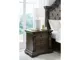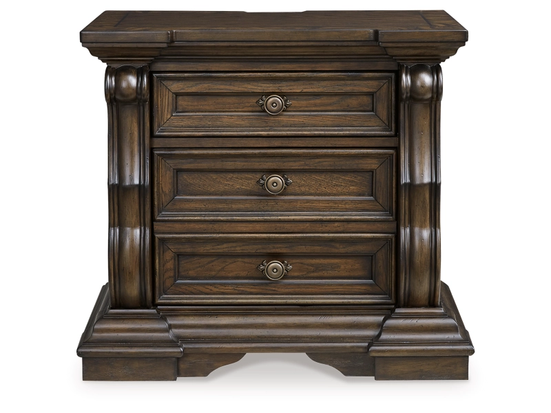 Opulent Traditional styling. Inspired by the grandeur and grace of Old World traditional style, this bedroom collection is nothing short of stunning. A choice blend of materials is accented by detailed ornamental appliques and large-scale decorative scrolled pilasters make a grand stance. Made with hardwood solids, oak and ash swirl veneers with MDF substrates and cast resin components. Finished in a dark brown coloration. The panel bed features sculptural ornate details upholstered headboard and footboard is covered in a button tufted softly textured chenille in a pewter color. Poster bed features grand mansion style posts and metal canopy with sculptural ornate details, upholstered headboard covered in a button tufted, softly textured chenille in a pewter color. Top of cases include an ash swirl border and dark walnut inlay. Accented with antique gold toned drawer pulls. Three drawer night stand features a concealed drawer for keeping valuables out of sight and includes a 110V power supply with dual USB charging ports.