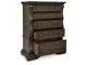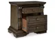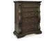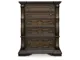 Opulent Traditional styling. Inspired by the grandeur and grace of Old World traditional style, this bedroom collection is nothing short of stunning. A choice blend of materials is accented by detailed ornamental appliques and large-scale decorative scrolled pilasters make a grand stance. Made with hardwood solids, oak and ash swirl veneers with MDF substrates and cast resin components. Finished in a dark brown coloration. The panel bed features sculptural ornate details upholstered headboard and footboard is covered in a button tufted softly textured chenille in a pewter color. Poster bed features grand mansion style posts and metal canopy with sculptural ornate details, upholstered headboard covered in a button tufted, softly textured chenille in a pewter color. Top of cases include an ash swirl border and dark walnut inlay. Accented with antique gold toned drawer pulls. Three drawer night stand features a concealed drawer for keeping valuables out of sight and includes a 110V power supply with dual USB charging ports.