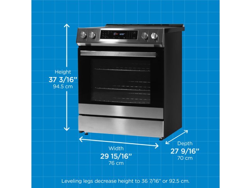 - 30-inch slide-in induction range with black stainless-steel finish for a modern look