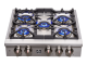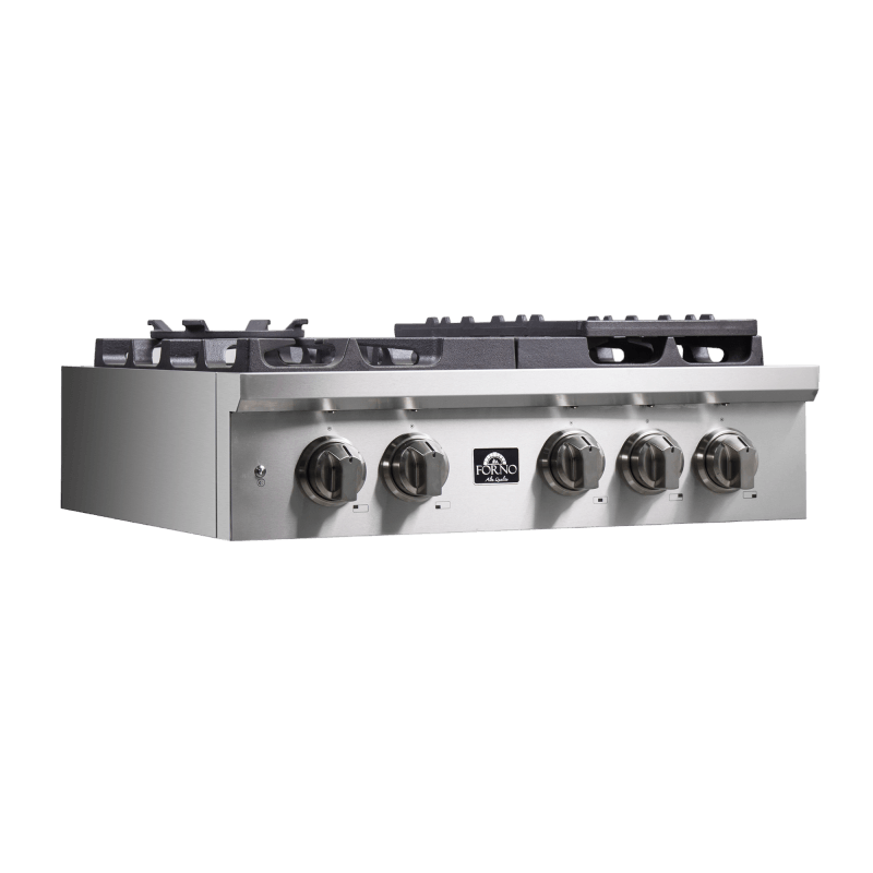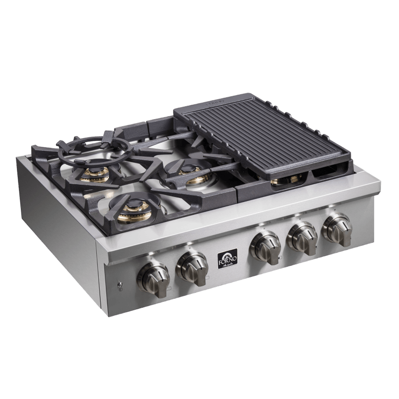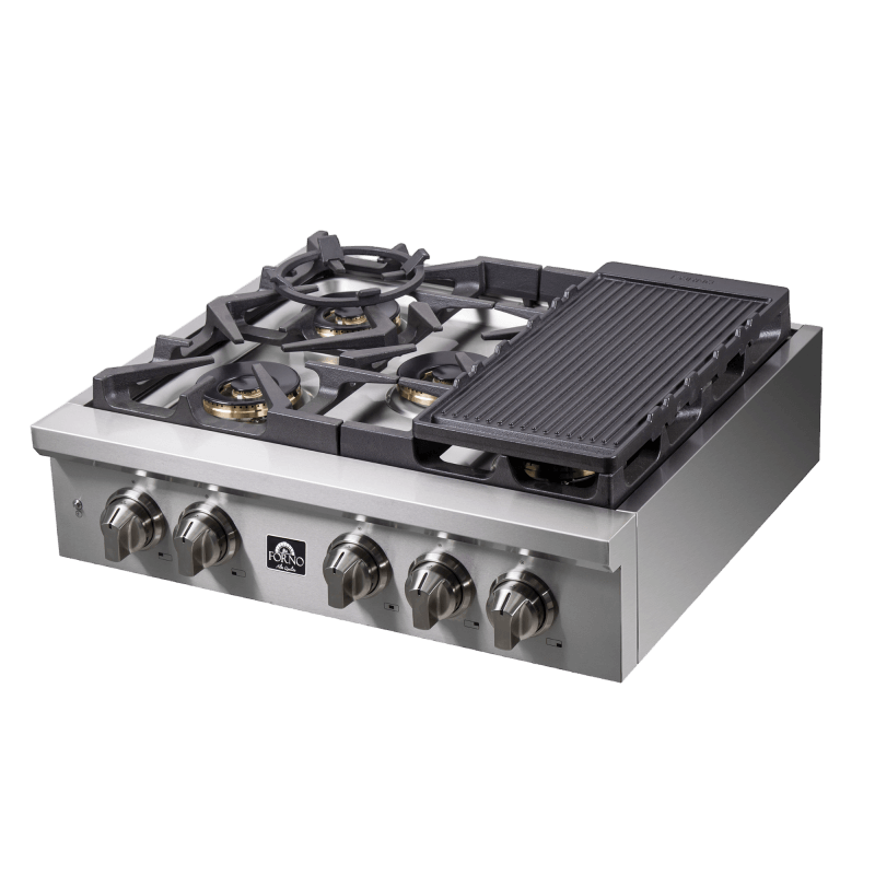 The FORNO ALTA QUALITA 30” Pro-Style Gas Rangetop has a versatile cooktop configuration with 5 sealed dual brass burners totalling 100,000 BTUs to handle any culinary challenge. Heavy duty continuous cast iron grates simplify moving pans around without lifting them off the surface and contoured Zinc Control Knobs allow easy control of the burners for precision gas cooking. Includes Auto-ignition, Griddle, Wok-Ring and LP conversion Kit. Heavy-duty 304 stainless steel cleans easily and beautifully complements other Forno appliances to fit any kitchen design.