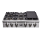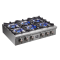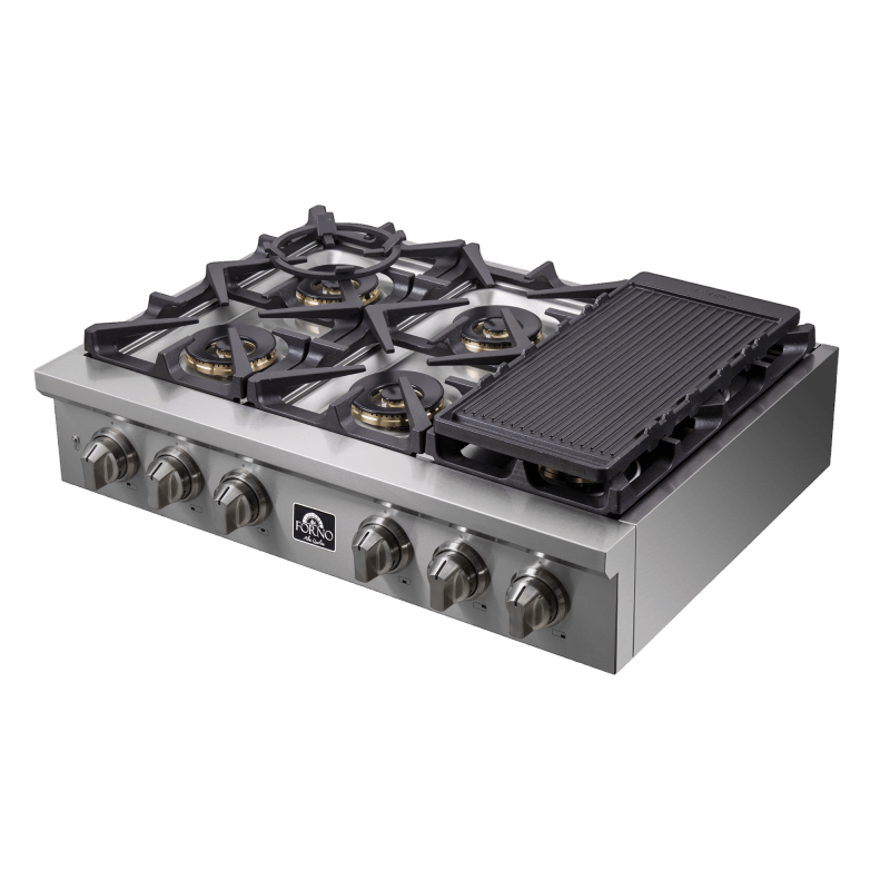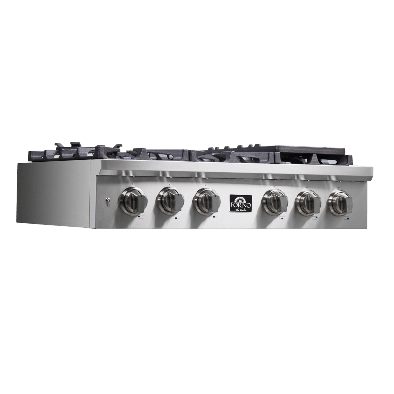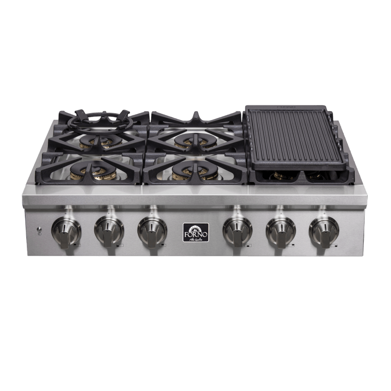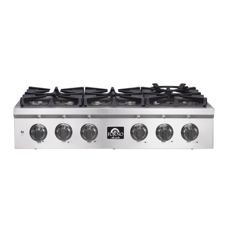 The FORNO ALTA QUALITA 36” Pro-Style Gas Rangetop has a versatile cooktop configuration with 6 sealed dual brass burners totalling 120,000 BTUs to handle any culinary challenge. Heavy duty continuous cast iron grates simplify moving pans around without lifting them off the surface and contoured Zinc Control Knobs allow easy control of the burners for precision gas cooking. Includes Auto-ignition, Griddle, Wok-Ring and LP conversion Kit. Heavy-duty 304 stainless steel cleans easily and beautifully complements other Forno appliances to fit any kitchen design.