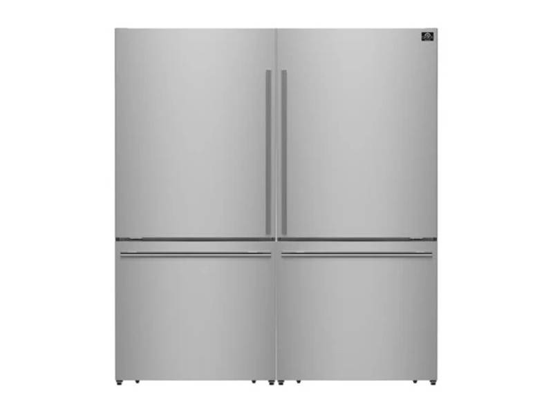 The Forno Milano 62-Inch Freestanding Dual Bottom Freezer Refrigerator brings together two 31-inch units to create a combined 34.4 cu.ft of organized, reliable storage—so you can shop big, prep ahead, and host with confidence. Each compartment operates independently, giving you four distinct climate zones to store meat, produce, beverages, and frozen goods exactly how they’re meant to be kept. An automatic ice maker on the left side ensures drinks are always cold and ready for company. Digital touch controls and interior LED lighting provide modern ease and visibility, while fingerprint-resistant stainless steel keeps your kitchen looking sharp every day. Whether you’re feeding a growing family, entertaining a crowd, or just love having space to spare, the Milano offers unmatched flexibility—all without the cost or complexity of a built-in. Forno – lower the cost of living without lowering your standards.