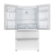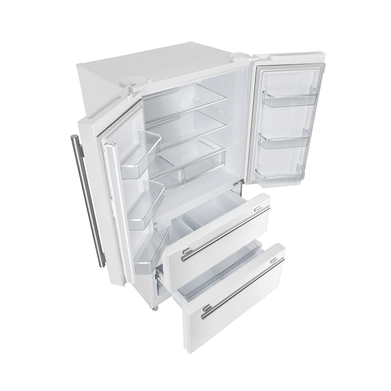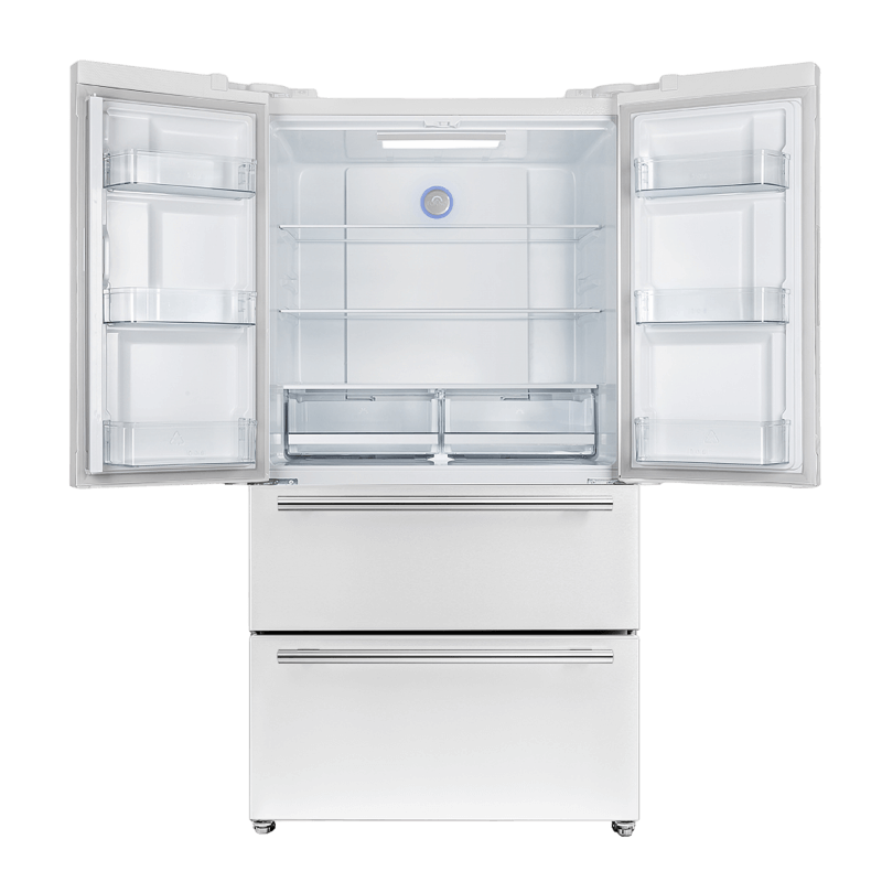 The Forno Espresso Moena 36-inch White French Door refrigerator combines style and functionality with its frost-free multi-air flow cooling system, offering a spacious 19.2 cu.ft. capacity. Adjustable shelving ensures versatile grocery storage, complemented by a compressor inverter for energy efficiency, quiet operation, and precise temperature control. The LED touch panel provides convenient access. The fresh food storage (12.1 cu.ft.) includes three glass shelves (two adjustable), two crisper drawers, and ample door storage. The 7.2 cu.ft. freezer features organized storage with two pull-out drawers, a slide-out tray, and a high-capacity automatic ice maker able to produce up to 4 pounds of ice daily. ENERGY STAR Certified, it incorporates high-efficiency LED lighting. The Espresso collection offers customizability with two sets of handles (stainless-steel or antique brass), adding an elegant finishing touch to this high-performing and stylish appliance.