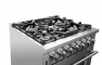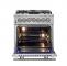 The Massimo 30 Inch Dual Fuel Range delivers professional style and durability to your home kitchen with its robust stainless-steel design. The cooktop features 5 sealed burners, 68,000 BTU output which one is a 20,000 BTU dual-ring burner that can reach a simmer of 1,000 BTU for precise simmering. Continuous cast iron grates ensure stability over the enamel cooktop cavity, containing spills for easy cleaning. The 4.32 cu.ft. true convection fan oven boasts a blue enamel interior, making cleaning a breeze. The 3-layer glass oven door window retains heat and provides a clear view. With a powerful 6,300 Watts output, this oven excels in baking, roasting, and broiling. Included are 2 telescopic oven racks, wok support, griddle, air-fryer kit with drip pan, a NEMA 14-50P power cord and an LP conversion kit. Housed in a high-grade stainless steel body with illuminated zinc knobs, the Massimo offers a stylish, long-lasting addition to your kitchen.