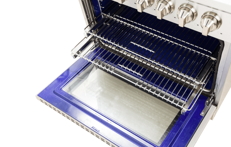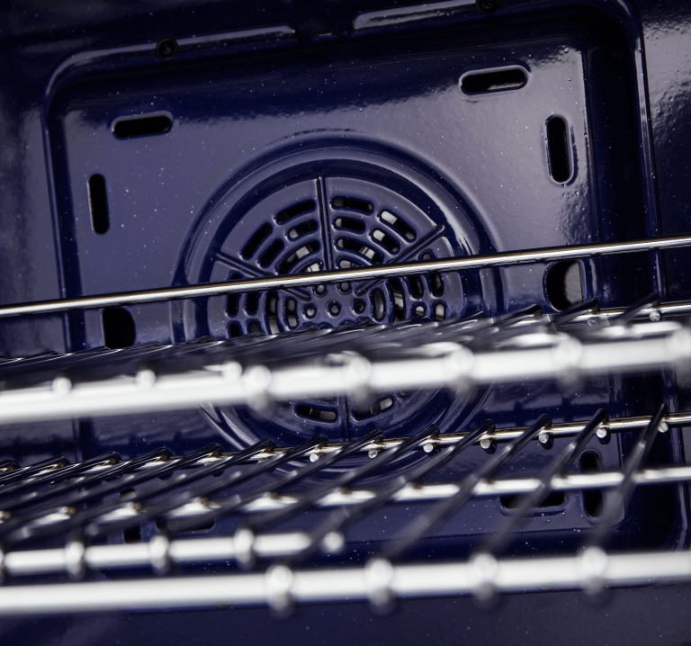 - 4.32 cu.ft speckled blue true convection oven with 6,300 Watts total broil and bake output.