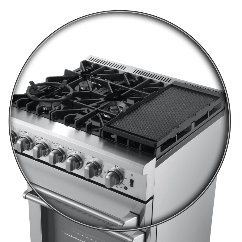 - Continuous cast iron grates ensure even heat, providing cookware stability and mobility off the source.