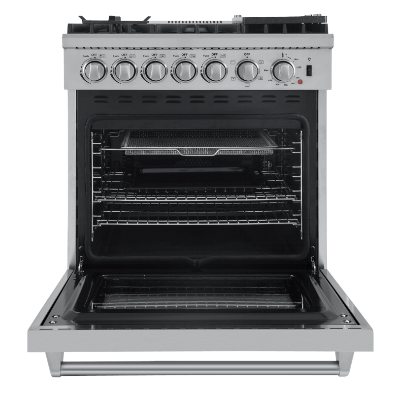 The Lazio 30 Inch Alta Qualita Dual Fuel Range blends professional design with durability. Its stainless-steel structure boasts 5 sealed burners (70,000 BTU total), including a potent dual-ring burner for boiling or searing and precise simmering. The continuous cast iron grates, wok ring, and reversible grill/griddle enhance cooking versatility. The 4.32 cu. ft. oven, with 6500 Watt combined convection broil and bake output, features an insulated 3-layer glass door for safety and visibility. The true convection element ensures fast, precise, and consistent cooking. Accessories include 2 oven racks, air fry rack & basket, drip pan (suitable for steam cleaning), and an LP conversion kit. Zinc-coated metal knobs with bezel rings ensure enduring beauty.