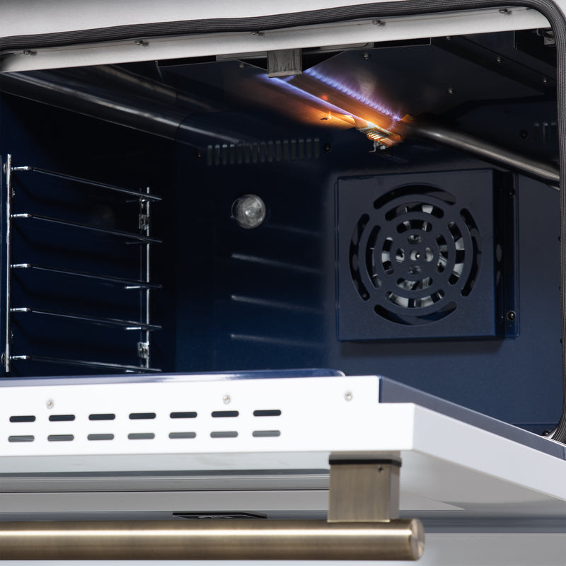 The Forno Massimo 30 Inch Gas Range harmonizes professional style and durability with antique brass. Its 5 sealed burners, totaling 68,000 BTU, include a precision 20,000 BTU dual-ring burner that can simmer at 1,000 BTU. Continuous cast iron grates ensure stability on the enamel surface. The 4.32 cu.ft. convection oven, with a blue enamel interior and 3-layer glass window, reaches 30,000 BTU for versatile cooking. It features 2 telescopic racks, an air fryer kit, a wok support, a reversible griddle, an LP conversion kit, and durable zinc-coated metal knobs. Elevate your kitchen with performance, convenience, and enduring elegance.