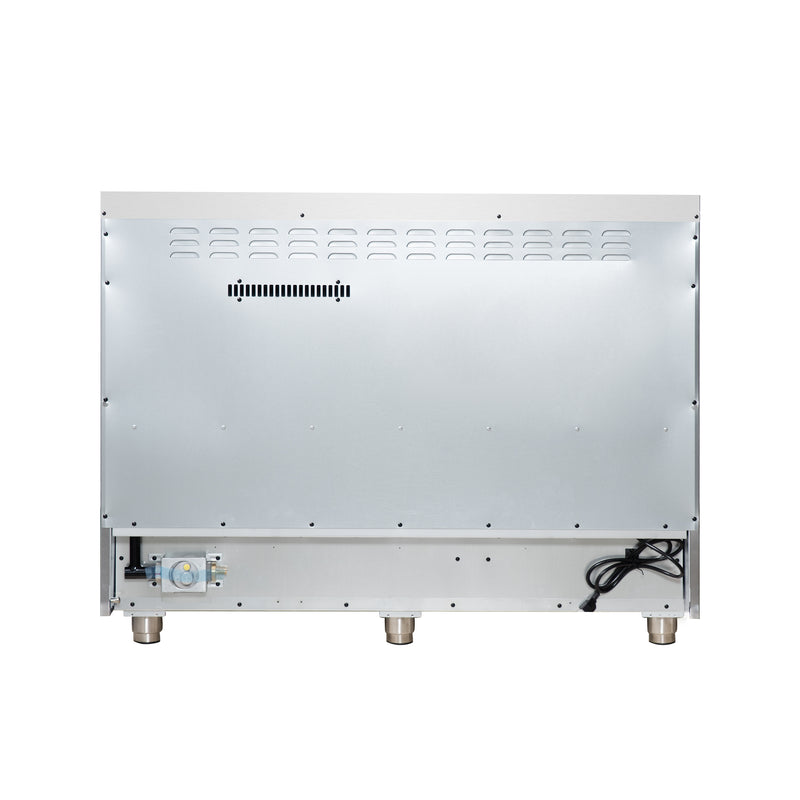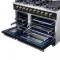 The Forno Massimo 48 Inch Gas Range in Black harmonizes professional style and durability with Antique Brass. Its 8 sealed burners, totaling 107,000 BTU, include a precision 20,000 BTU dual-ring burner that can simmer at 1,000 BTU. Continuous cast iron grates ensure stability on the enamel surface. The main oven of 4.32 Cu.Ft has a convection fan with 30,000 BTU Total Broil and Bake output. The secondary oven has a capacity of 2.26 Cu.Ft. with a 14,000 BTU Bake output. Both ovens have an impressive blue enamel interiors allowing for easy cleaning and 3-layer glass oven door window provides both heat retention and an unobstructed view. It features 2 telescopic racks per oven, an air fryer kit, a wok support, two reversible griddle, an LP conversion kit, and durable zinc-coated metal knobs. Elevate your kitchen with performance, convenience, and enduring elegance.