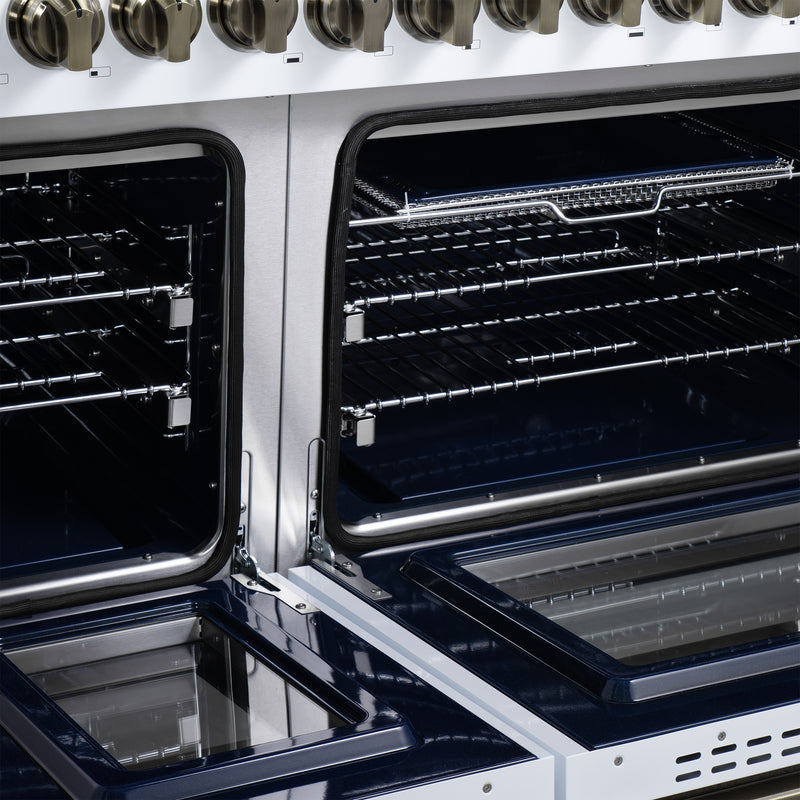 The Forno Massimo 48 Inch Gas Range in White harmonizes professional style and durability with Antique Brass. Its 8 sealed burners, totaling 107,000 BTU, include a precision 20,000 BTU dual-ring burner that can simmer at 1,000 BTU. Continuous cast iron grates ensure stability on the enamel surface. The main oven of 4.32 Cu.Ft has a convection fan with 30,000 BTU Total Broil and Bake output. The secondary oven has a capacity of 2.26 Cu.Ft. with a 14,000 BTU Bake output. Both ovens have an impressive blue enamel interiors allowing for easy cleaning and 3-layer glass oven door window provides both heat retention and an unobstructed view. It features 2 telescopic racks per oven, an air fryer kit, a wok support, two reversible griddle, an LP conversion kit, and durable zinc-coated metal knobs. Elevate your kitchen with performance, convenience, and enduring elegance.