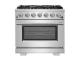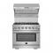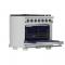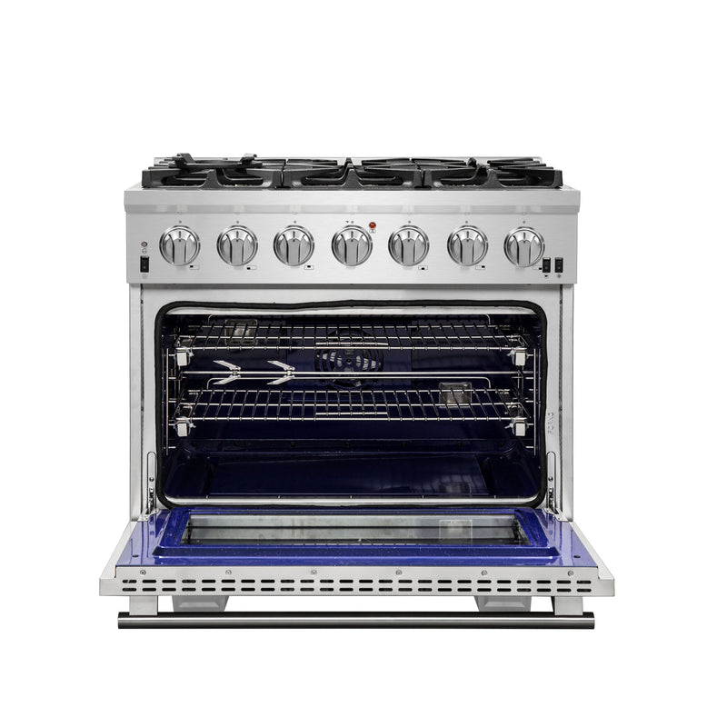 The Forno Capriasca 36 Inch Gas Range enhances your home kitchen with professional styling and performance through its durable and beautiful 304-grade stainless-steel design. The cooking surface features 6 sealed dual-ring brass burners, totaling 120,000 BTU. All burners, each at 20,000 BTU, can simmer precisely at 1,000 BTU. Continuous heavy-duty cast-iron grates facilitate easy sliding of pots or pans off heat over the enamel cooktop cavity, simplifying spill cleanup. The 5.36 cu. ft. gas oven, with a 30,000 BTU output and infrared red mesh broiler, enclosed in a blue enamel interior, offers optional convection for precise, and consistent cooking on multiple levels. For convenient viewing, a 3-layer glass oven door window is included. The package includes 3 telescopic stainless-steel oven racks, wok support, and an LP conversion kit. Additionally, zinc-coated illuminated metal knobs with bezel rings ensure enduring beauty.