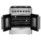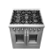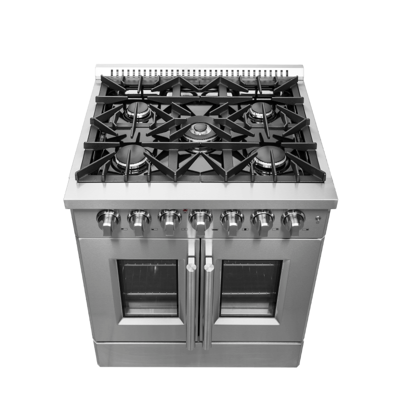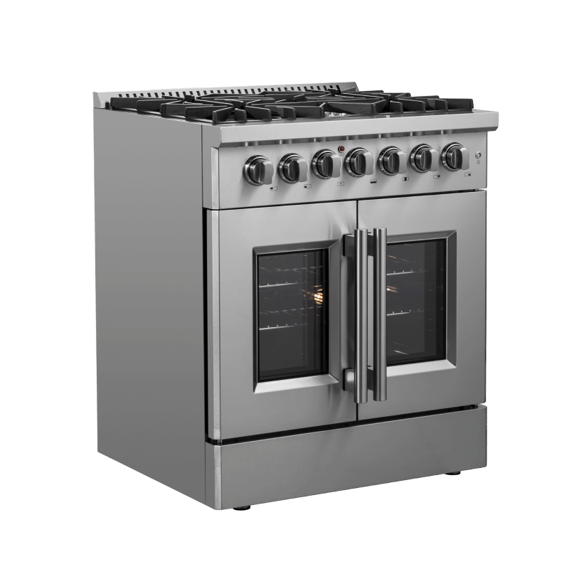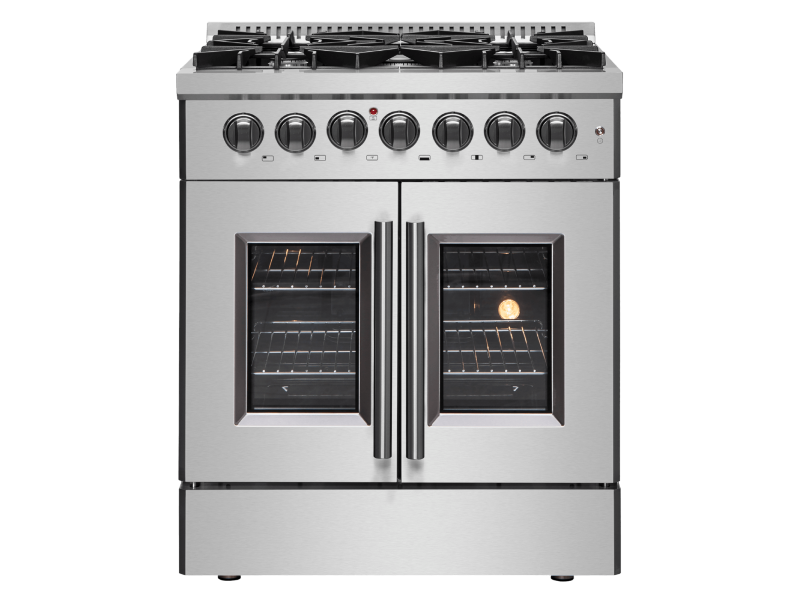 The 30 Inch Galiano Dual Fuel French Door Range brings professional styling and Performance into your home kitchen with its durable stainless-steel design. Unique french doors mean open doors allow up to 12 Inch of more space to access your oven. Cooking Surface has 5 sealed burners with a total output of 68,000 BTU including 1 sealed dual-ring burner for simmering melting chocolate or cooking sauces, 20K dual-ring burner for boiling or searing and is able to perform simmering like melting chocolate or sauces, The continuous cast iron grates allow maximum stability of cookware and mobility over a recessed enamel Cooking Surface cavity which keeps spills and splashes contained and easy to clean. The 4.32 cu. ft. electric oven with a total output of 4,800 Watts is encased in a black enamel interior fitted with an true convection fan ensures to achieve fast, precision and consistent oven cooking along for easy viewing is a 3-layer glass oven door window. Included are 2 chrome plated oven racks and LP conversion kit. Additionally, zinc coated metal knobs with bezel rings will maintain their beauty for years.