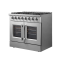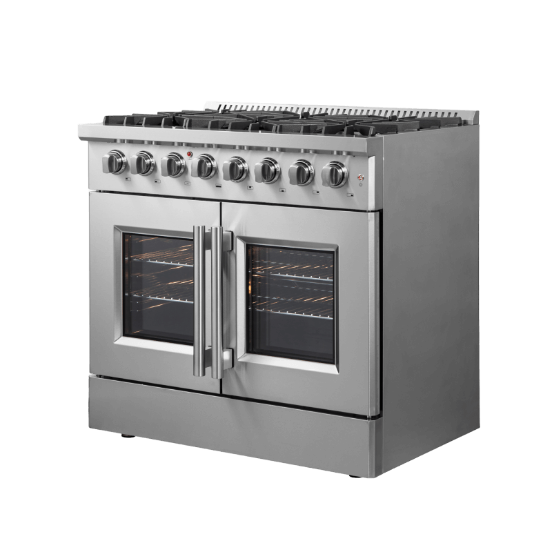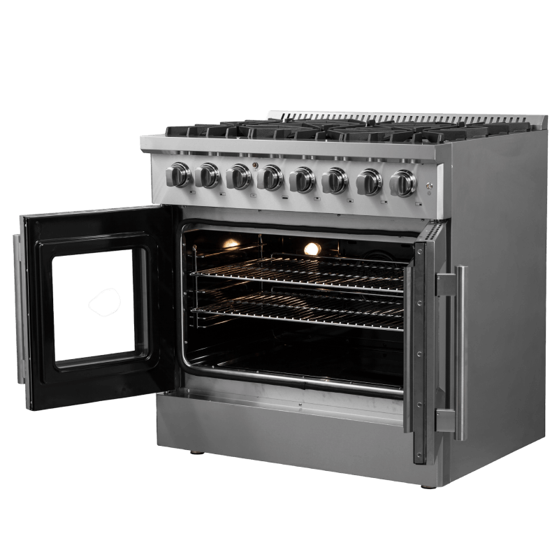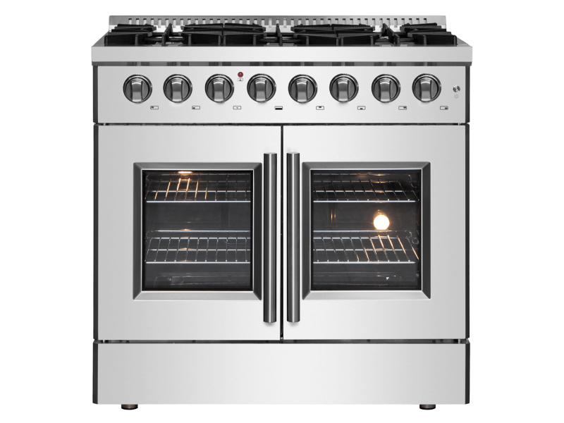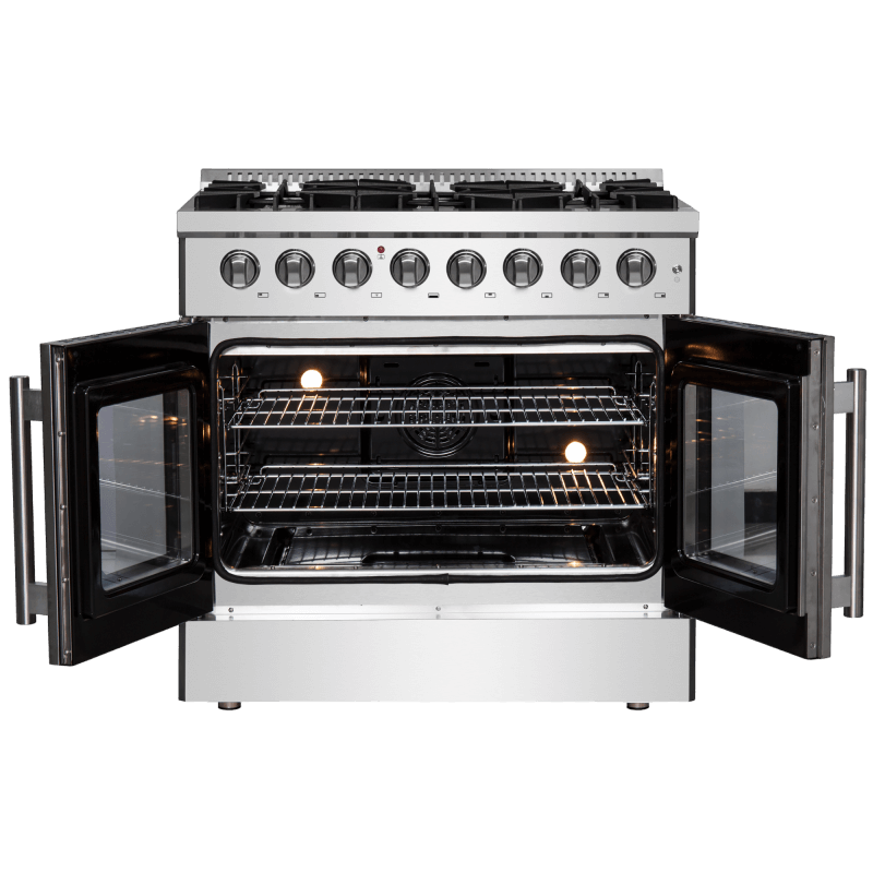 The 36 Inch Galiano Dual Fuel French Door Range brings professional styling and Performance into your home kitchen with its durable stainless-steel design. Unique french doors mean open doors allow up to 12 Inch of more space to access your oven. Cooking Surface has 6 sealed burners with a total output of 83,000 BTU including 1 sealed dual-ring burner for simmering melting chocolate or simmering sauces, 20K dual-ring burner for boiling or searing and is able to perform simmering like melting chocolate or sauces, The continuous cast iron grates allow maximum stability of cookware and mobility over a recessed enamel Cooking Surface cavity which keeps spills and splashes contained and easy to clean. The 5.36 cu. ft. electric oven with a total output of 4,800 Watts is encased in a black enamel interior fitted with an true convection fan ensures to achieve fast, precision and consistent oven cooking along for easy viewing is a 3-layer glass oven door window. Included are 2 chrome plated oven racks and LP conversion kit. Additionally, zinc coated metal knobs with bezel rings will maintain their beauty for years.