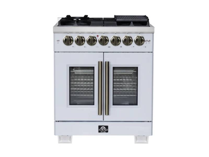 The Forno Capriasca 30 Inch French Door Dual Fuel Range in white with antique brass accessories brings professional-grade style and performance into your kitchen. Its signature French doors open outward to provide up to 12 inches of extra clearance, giving you easier access to the oven. The gas cooktop features five sealed dual-ring brass burners with a powerful 100,000 BTU total output, including a 20,000 BTU burner perfect for rapid boiling, high-heat searing, or gentle simmering of sauces and melted chocolate. Heavy-duty cast iron grates span the surface for maximum stability and smooth movement of cookware, while the recessed enamel cavity helps contain spills for effortless cleaning. Inside, the 4.32 cu. ft. electric oven delivers 6,300 watts of cooking power with true convection technology, ensuring fast, precise, and consistent results. A speckled blue enamel interior adds durability and easy maintenance, while the triple-layer glass oven door window provides clear visibility without sacrificing heat retention. The Capriasca also includes premium accessories: three stainless steel telescopic oven racks, an LP conversion kit, wok ring, reversible griddle, rotisserie kit with skewers, and an air fry basket with rack and drip pan.