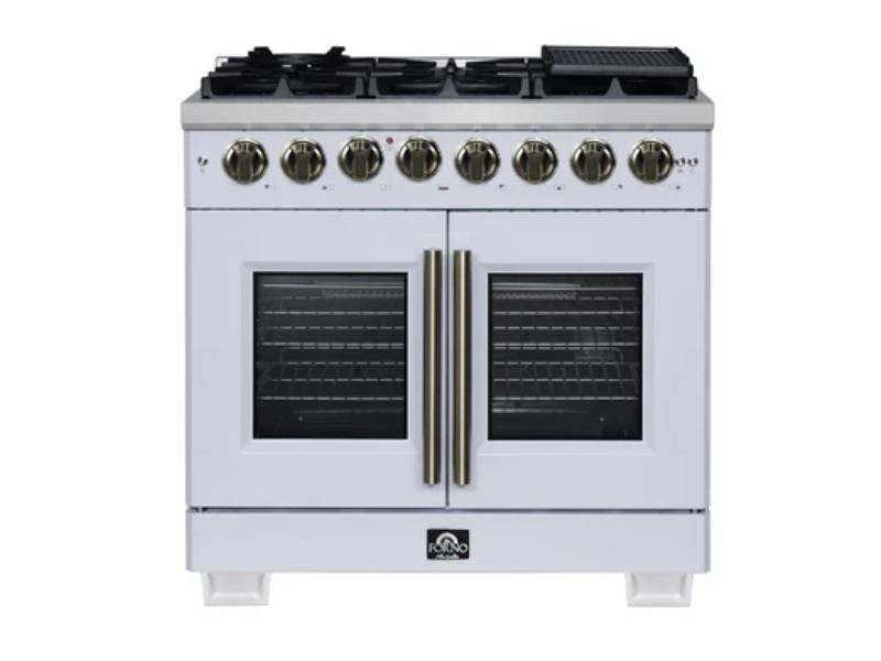 The Forno Capriasca 36 Inch French Door Dual Fuel Range in white with antique brass accessories brings professional style and high performance cooking into your home kitchen. Its signature French doors open outward, providing up to 12 inches of extra clearance for easier oven access. The range top features six sealed dual-ring brass burners with a powerful 120,000 BTU total output, offering the flexibility to achieve both intense searing and delicate simmering for sauces or melted chocolate. Heavy duty continuous cast iron grates ensure stability and smooth movement of cookware, while the recessed enamel cooktop cavity contains spills for easy cleanup. Inside, the 5.36 cu. ft. true convection oven delivers 6,300 watts of cooking power for fast, precise, and consistent results. A speckled blue enamel interior enhances durability and makes maintenance simple, while the triple-layer glass oven door window allows clear visibility without losing heat. Every detail is designed for performance and convenience, with included accessories such as an LP conversion kit, three stainless steel telescopic oven racks, wok support, reversible griddle, rotisserie kit with skewers, and an air fry basket with rack and drip pan.