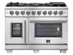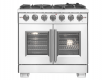 The 30” Forno Capriasca French Door Dual Fuel Range brings professional styling and Performance into your home kitchen with its durable stainless-steel design. Unique french doors mean open doors allow up to 12" of more space to access your oven. The gas rangetop has 5 sealed dual-ring brass burners with a total output of 100,000 BTU for simmering melting chocolate or cooking sauces, The heavy-duty continuous cast iron grates allowmaximum stability of cookware mobility over a recessed enamel Cooking Surface cavity which keeps spills and splashes contained and easy to clean. The 4.32 cu. ft. gas oven with a total output of 30,000 BTU is encased in a speckled blue enamel interior fitted with a convection fan, ensures to achieve fast, precision and consistent oven cooking along for easy viewing is a 3-layer glass oven door window. Included is an LP conversion kit, 3 stainless steel telescopic oven racks, wok-ring, reversible griddle, rotisserie kit and skewers forks, air fry basket with rack and drip pan. Additionally, zinc coated metal knobs with bezel rings will maintain their beauty for years. All FORNO products come with a 2 year warranty.