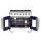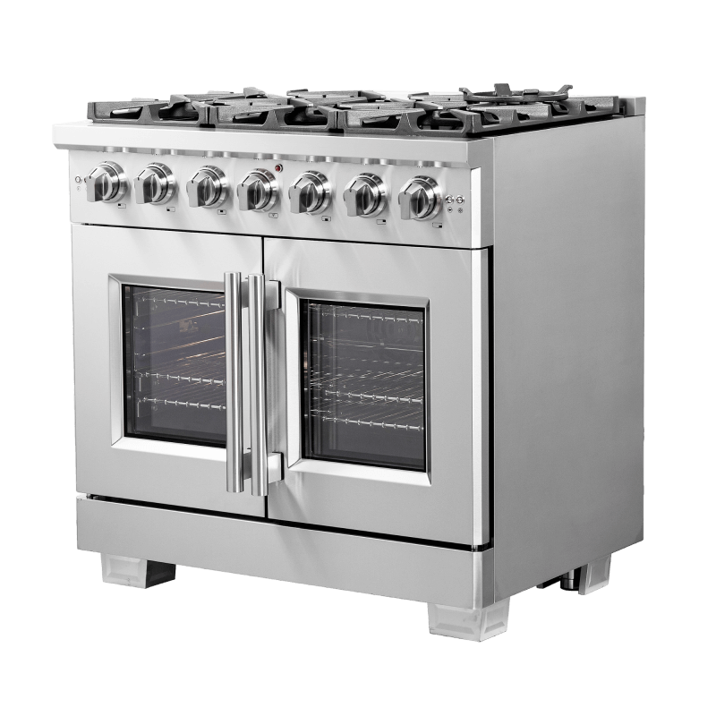 The 36” Forno Capriasca French Door Dual Fuel Range brings professional styling and Performance into your home kitchen with its durable stainless-steel design. Unique french doors mean open doors allow up to 12" of more space to access your oven. The gas rangetop has 6 sealed dual-ring brass burners with a total output of 120,000 BTU for simmering melting chocolate or sauces, The heavy-duty continuous cast iron grates allowmaximum stability of cookware mobility over a recessed enamel Cooking Surface cavity which keeps spills and splashes contained and easy to clean. The 5.36 cu. ft. gas oven with a total output of 30,000 BTU is encased in a speckled blue enamel interior fitted with a convection fan, ensures to achieve fast, precision and consistent oven cooking along for easy viewing is a 3-layer glass oven door window. Included is an LP conversion kit, 3 stainless steel telescopic oven racks, wok-ring, reversible griddle, rotisserie kit and skewers forks, air fry basket with rack and drip pan. Additionally, zinc coated metal knobs with bezel rings will maintain their beauty for years.