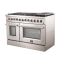 Introducing the Forno 48 Inch Galiano Dual Fuel Range, designed to bring professional style and quality to your kitchen with its robust stainless steel construction. This range features eight sealed burners, including a powerful 20,000 BTU double-ring burner, delivering a total of 107,000 BTU to meet all your cooking needs. Continuous cast-iron grates provide even heat distribution and stability for utensils. The enamel cooktop's recessed cavity ensures easy cleanup. It includes two electric ovens with a combined capacity of 6.58 cu.ft. and a total output of 9,700 Watts, housed in black enamel interiors with tempered three-layer glass doors. The right-side oven features a true convection system with a 1500 Watt fan heating element. Also included are an LP conversion kit, four electroplated oven racks, a griddle, and a NEMA 14-50P power cord. Zinc-coated metal knobs with bezel rings add a touch of lasting beauty.