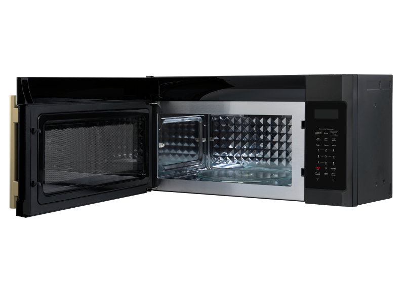 The Fornace 30 Inch Over the Range Microwave in Black combines microwave, convection, and speed cooking functions in one versatile appliance. Designed to be smudge-resistant, it features a sleek digital display, LED lighting, and an easy to clean washable filter. The touchpad controls and auto menu programs make everyday cooking simple, while multistage and cook time options offer precision. A durable plastic handle in antique brass ensures a comfortable, cool to touch grip that’s built for everyday use. With vertical, horizontal, and recirculating air discharge options, plus a powerful two-speed blower system (105/300 CFM), this undercabinet or wall-mounted microwave is a modern solution for efficient and reliable cooking.
