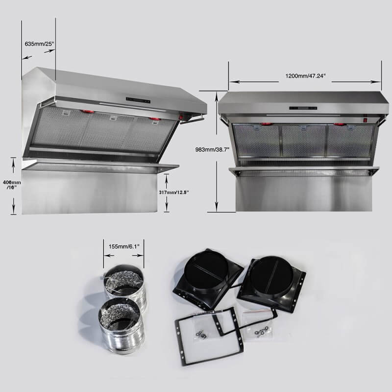 This 48 Inch Savona wall mount range hood by Forno helps create a durable, all stainless steel design. A quiet high-efficiency 1200 CFM of ventilation power. The hybrid mesh filtration system reduces odors and maximizes filtration effectiveness. Designed to be user-friendly to remove, and totally submersible, these filters go right into the dishwasher for the ultimate in easy clean. With versatile fan settings, you can adjust the capture speed based on your cooking needs. Includes upper level warming rack, heated via an Infra-red bulb to keep your food and dishes warm. Dual utensil hangers are perfect for keeping your most frequently used tools at hand or to display your pans. Lower the cost of living with Forno.