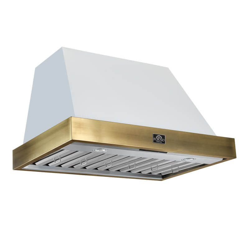 Enhance your kitchen with the Vittorio 36" Range Hood, combining style and performance. With a powerful 600 CFM motor, it efficiently removes smoke, odors, and grease, keeping your kitchen fresh. The 3-speed fan control adapts to any cooking situation, while dishwasher-safe baffle filters make cleanup easy. Enjoy convenient touch and remote controls for effortless operation, and energy-efficient LED lights that brighten your cooking area. The low-noise operation ensures a peaceful kitchen environment. The elegant white design with antique brass detailing adds a vintage touch to your space. Designed for flexible installation, the Vittorio suits both wall-mounted and under-cabinet setups. The 3-minute power-off delay ensures fresh air even after cooking. With a 2-year warranty covering parts and labor, this range hood delivers reliable performance and peace of mind. Lower the cost of living with Forno.