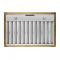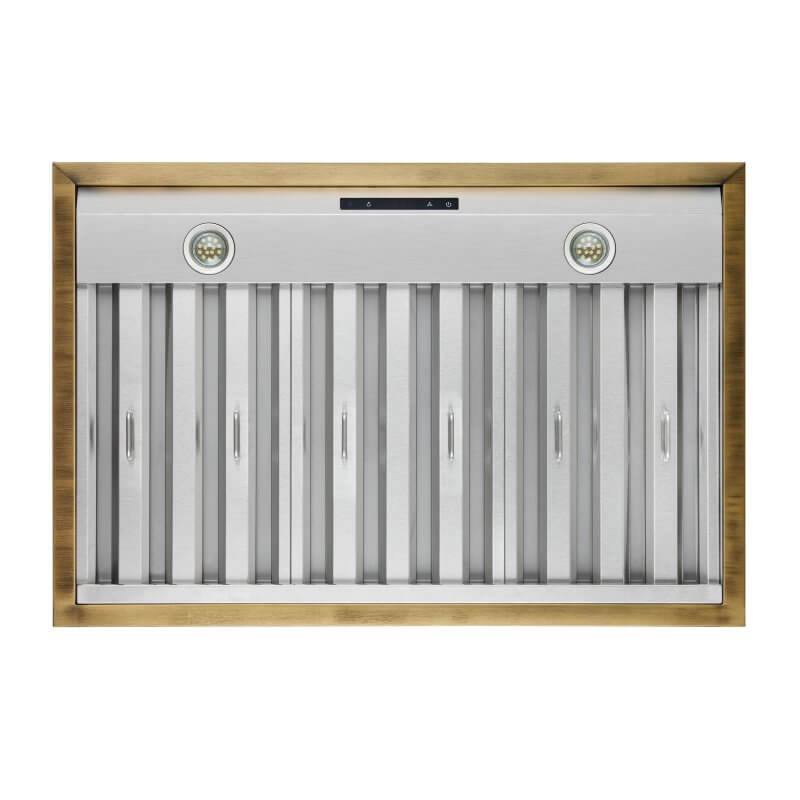 - Elegant white range hood with an elegant antique brass bottom contour, adding a touch of vintage charm to any kitchen.