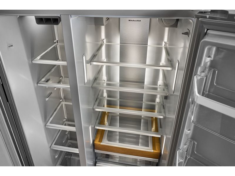 Make room for every grocery run and farmers market haul with this large capacity counter-depth side-by-side refrigerator from KitchenAid brand. Counter-depth design fits with surrounding cabinetry to create a built-in appearance. Panoramic LED Lighting illuminates every angle to keep ingredients in sight and easy to find. And an Exterior Ice and Water Dispenser with Measured Fill allows you to select and dispense the exact amount you need in ounces, cups or liters.