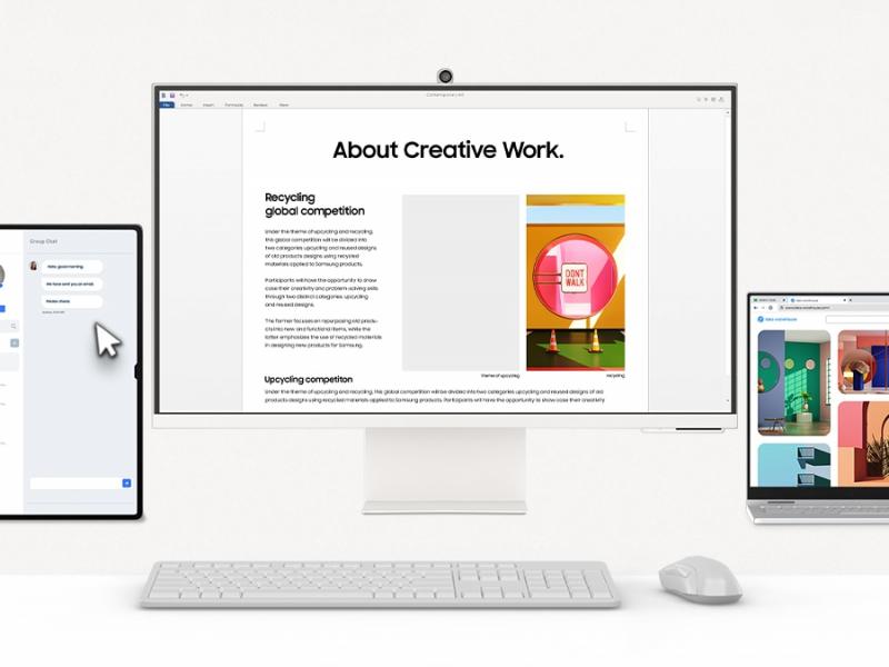 Take multitasking and productivity to the next level. Seamlessly drag and drop documents and images across multiple Samsung devices onto your Smart Monitor for a clearer view and larger workspace — all with a single mouse and keyboard.8