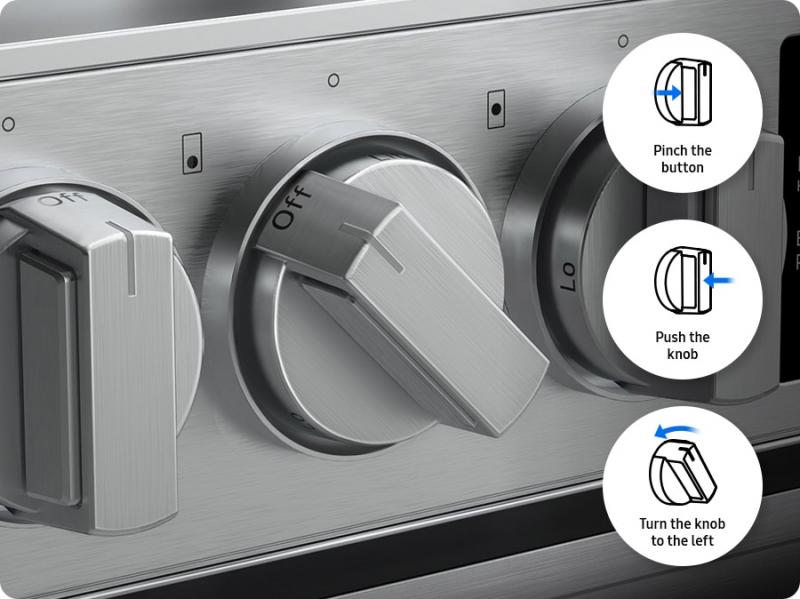 Precisely control and ensure proper activation of your cooktop. The Precision Knob buttons must be pinched in before the knobs can be pushed and turned, so that you can be sure you only turn on the range when you want it on and help avoid unintentional push-and-turns.