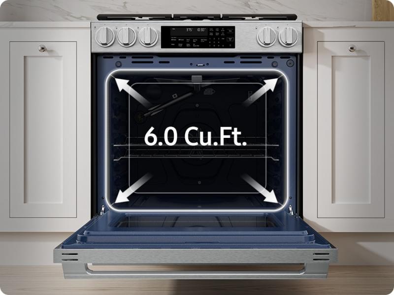 Accommodates large cookware and family-sized meals with a huge 6.0 cu. ft. capacity oven, making it perfect for everyday dinners or entertaining guests. Prepare multiple dishes at once or easily cook large items like a big roast or holiday turkey.