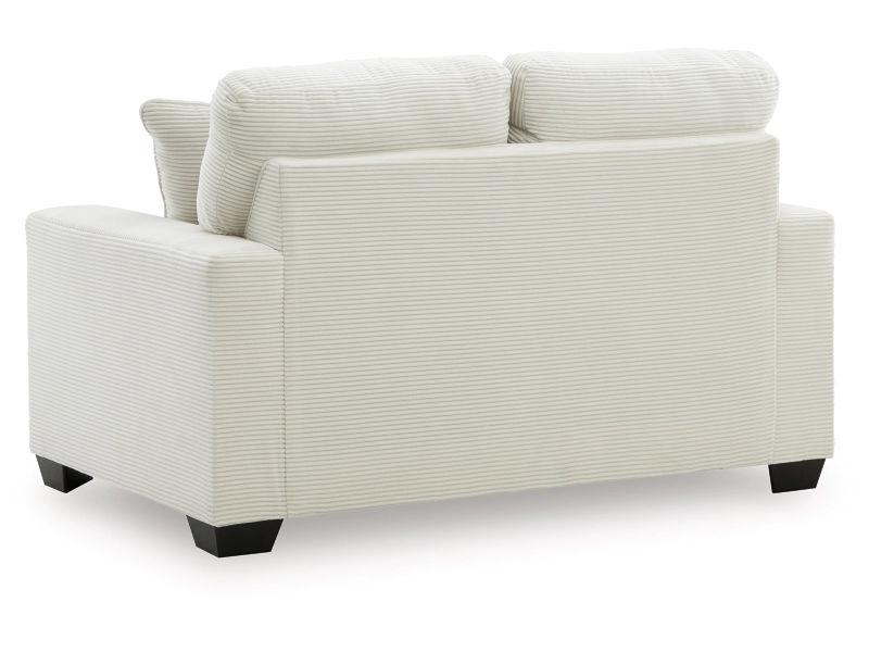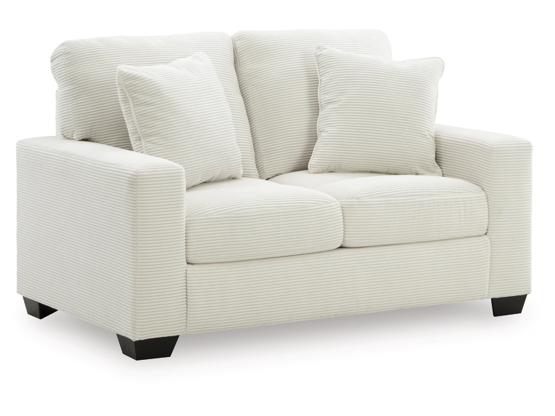 The crisp neutral hue and striking design details of this loveseat create a living room that expertly reflects your contemporary taste. For irresistibly cool textural appeal, the ultra-soft fabric is enhanced by a small-scale corded look. With a clean-lined silhouette complete with track arms, this loveseat allows you to take a trend-right approach to everyday living.