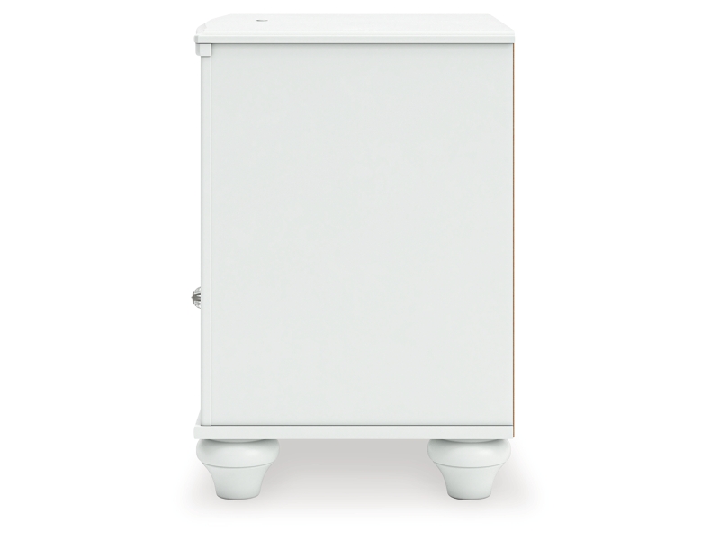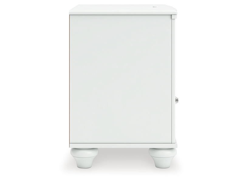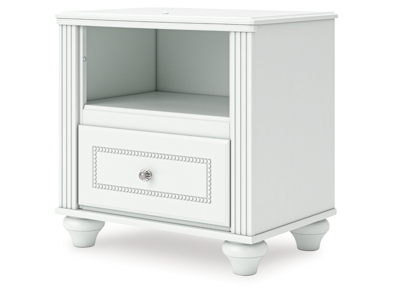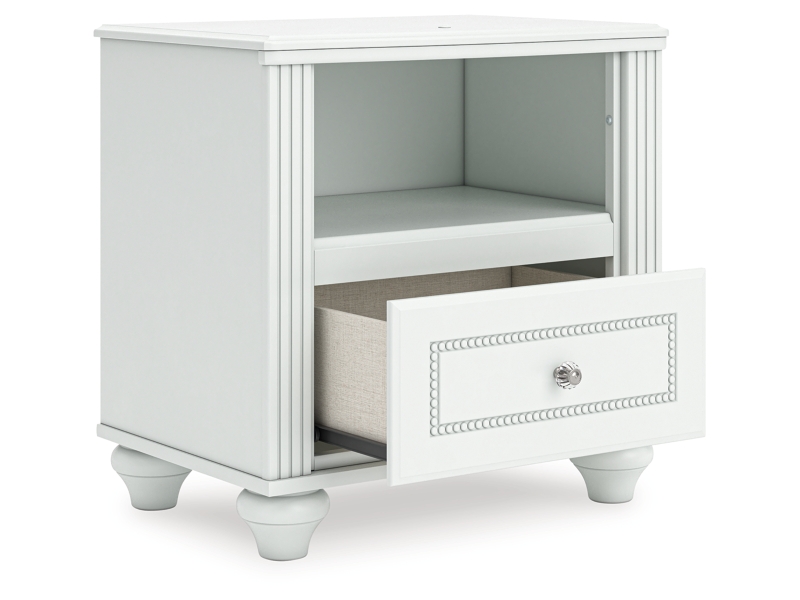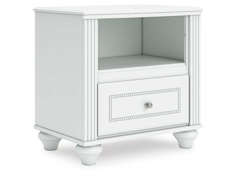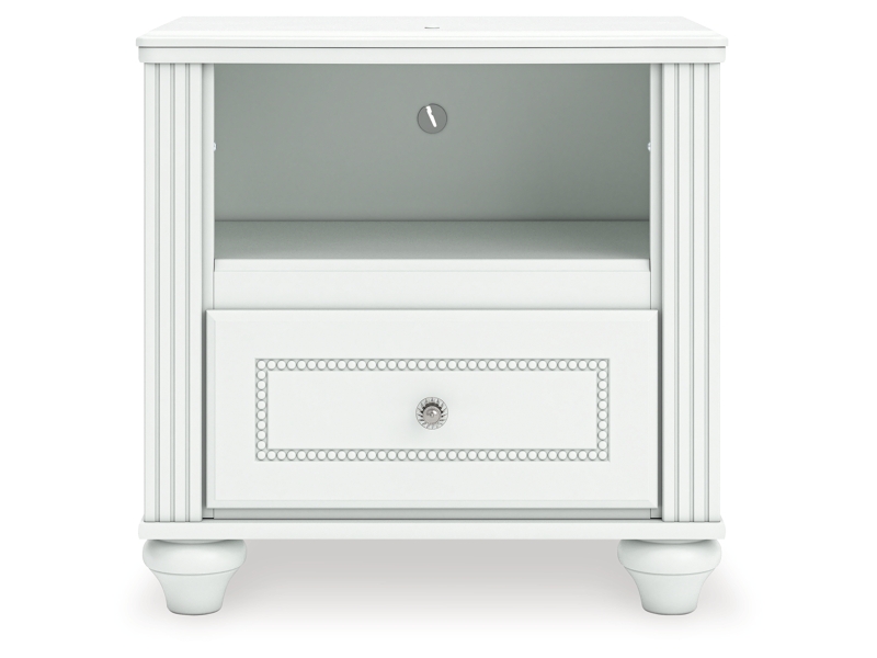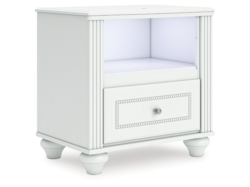 Fit for a princess. This nightstand’s crisp matte white finish pairs with charming ornate beading details and bun feet—perfect for your girly girl. Multicolored LED lighting and built-in USB charging are the crowning touches to make your little one feel like royalty.