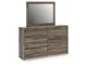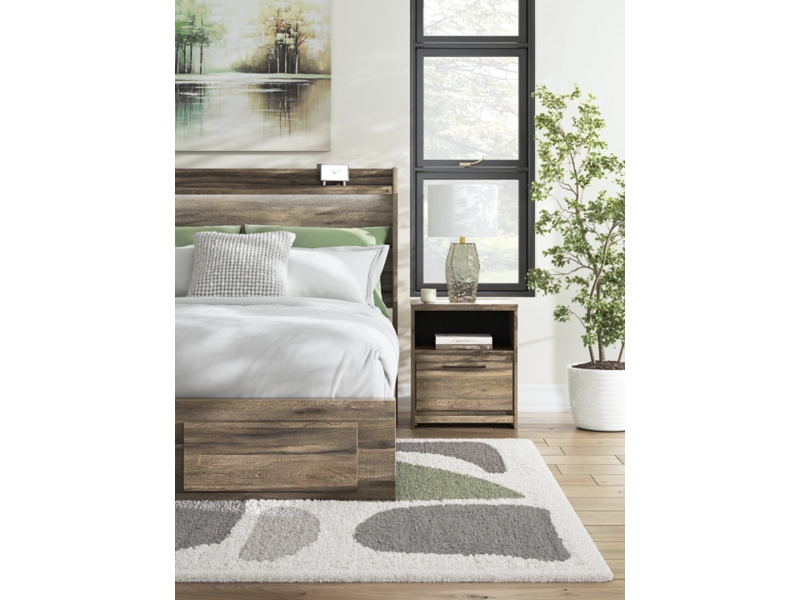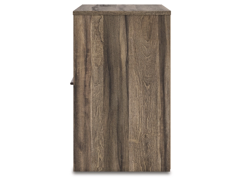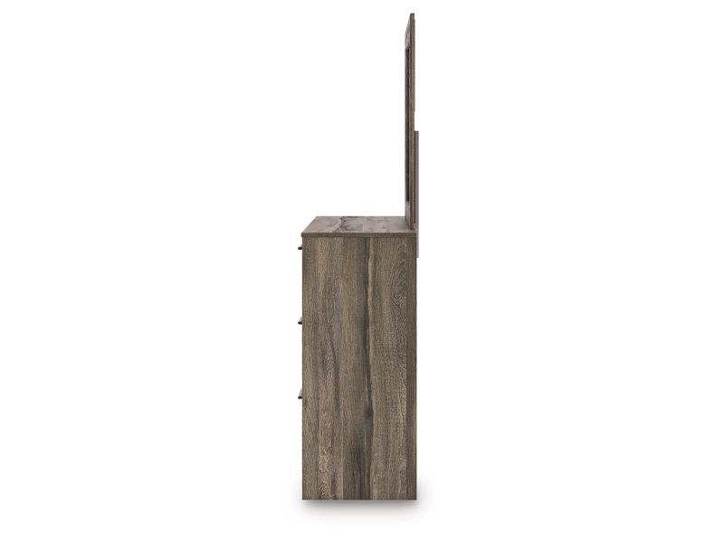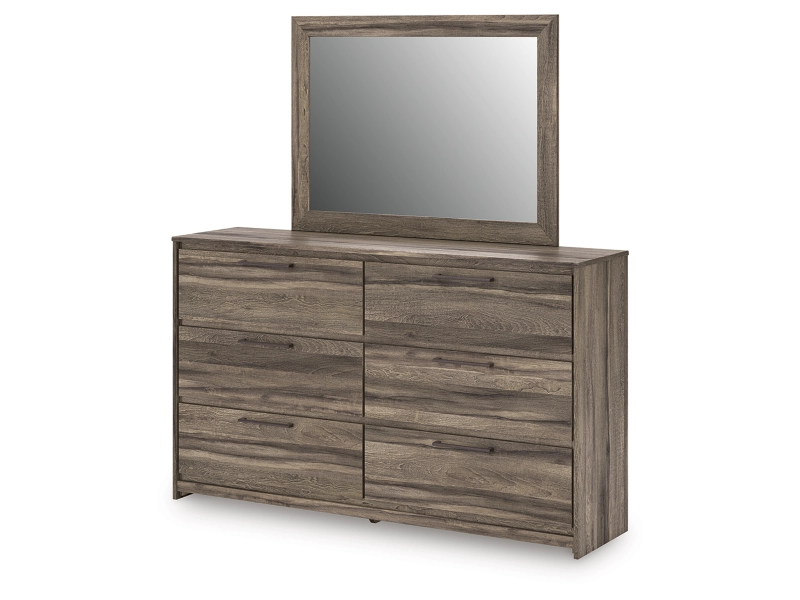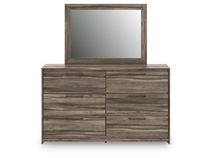Casually cool style and lots of storage go hand in hand with this bedroom package. A weathered brown finish over replicated oak grain creates an easygoing vibe, setting the scene in your restful retreat. The set's clean lines and modern handles provide a fuss-free look.