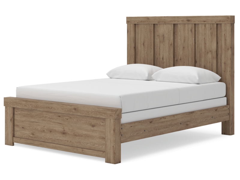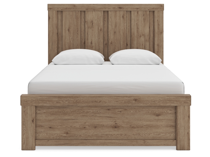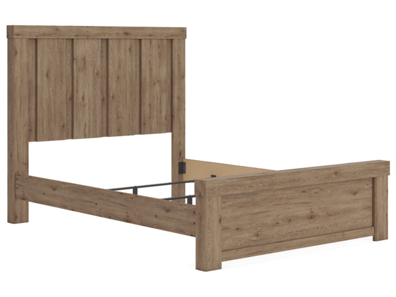 This queen panel bed delivers a fresh, trend-right spin on rustic design. Its natural wood tones, log-look accents and dimensional detailing create a look that’s effortlessly chic yet grounded in authenticity. Complete with log-look accents capping the headboard and footboard, this bed has a substantial style that feels timeless.