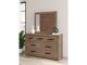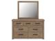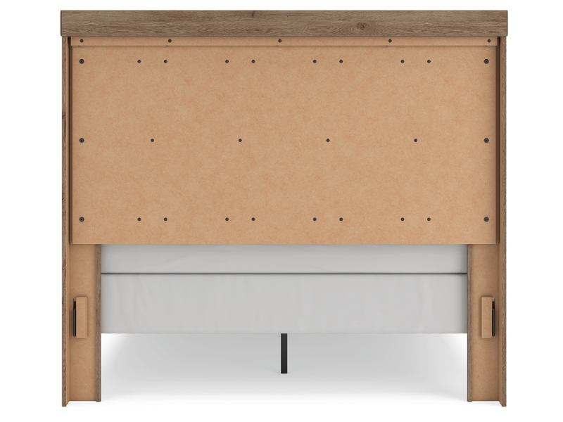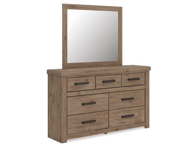 Natural rustic finish over replicated oak grain with authentic touch. Cases feature framed tops and large scale dark bronze colored hooded pulls. Slim USB charger located on the back of the nightstand tops. Side roller glides for smooth operating drawers. Headboards feature vertical paneling and imitated log details. Headboards (57,58) attach to footboards (54,54S,56,56S) respectively. Storage footboard options (54S,56S) require the use of the B100-13 or the B100-14 roll slats. Platform rail option (95) requires the use of the B100-13 or the B100-14 roll slats. Panel rails (96,97) require the use of a box spring. Mirror (36) has the versatility to be mounted on dresser or wall vertically and horizontally. Safety is a top priority, clothing storage units are designed to meet the most current standard for stability, ASTM F 2057 (ASTM International). Drawers extend out to accommodate maximum access to drawer interior while maintaining safety.