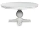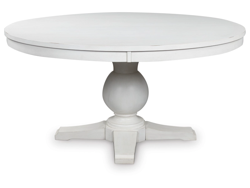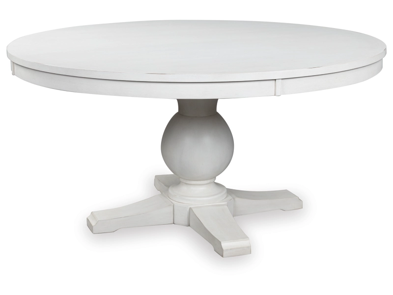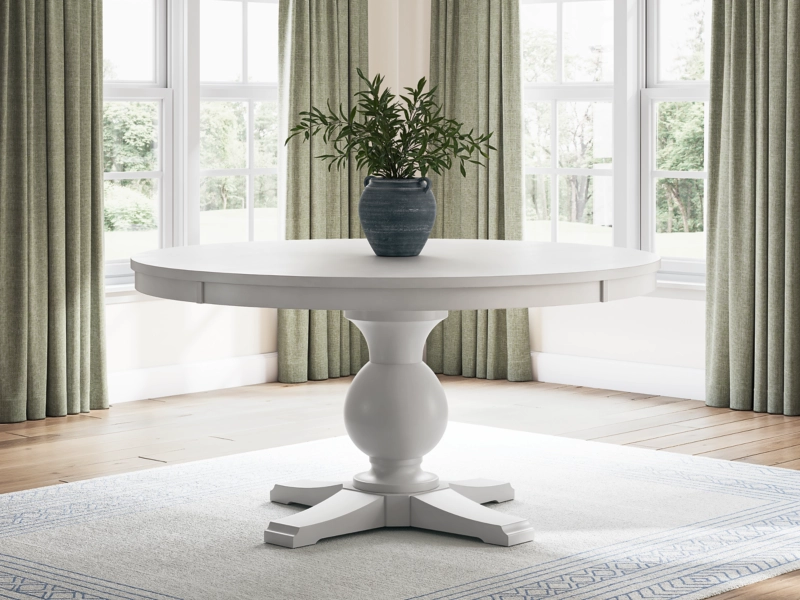 This Traditional Farmhouse collection blends hardwood solids, wood veneers, and MDF with eclectic finishes for mix-and-match styling. Dining table options include an 8-seat (D824-25) and 6-seat counterheight (D824-13) with thick mango wood veneer tops and chunky turned legs in a medium brown wood-tone. A 60" round dining table (D824-50T/B) features a thick top and antique white cast resin pedestal. For a modern farmhouse look, the D824-55T/B trestle table offers a chunky Mindi wood veneer inlay top and a painted black base. Chair options include stylized ladder-back (black D824-07, medium brown D824-09; counterheight black D824-724, medium brown D824-924), vintage-inspired bistro (black D824-01, antique white D824-02; counterheight black with wood seat D824-124, antique white wood seat D824-224), and spindle back (black D824-05, medium brown D824-06), all with adjustable levelers. A tall arched curio with three fixed shelves and metal-framed doors (antique white D824-276, two-tone black/medium brown D824-376, medium brown D824-476), and an accent cabinet (D824-186) with tall door cabinets, reversible wine shelves, and bottom drawers.
