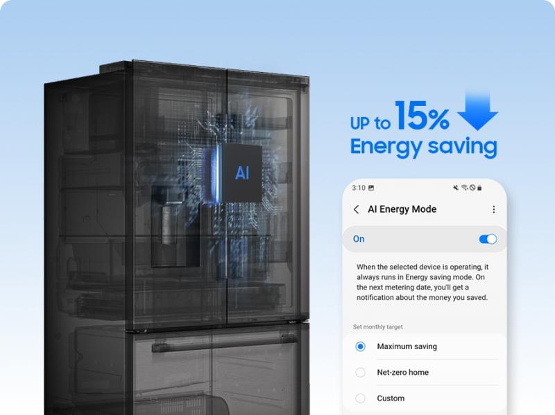 ³Comparing factory setting temperature without AI Energy mode and with AI Energy, which optimizes the compressor speed and defrost cycle based on usage pattern and conditions. Results may vary depending on the usage pattern and conditions. ⁴AI Energy Mode must be turned on in the SmartThings App available on Android and iOS devices. A Wi-Fi connection and a Samsung account are required.