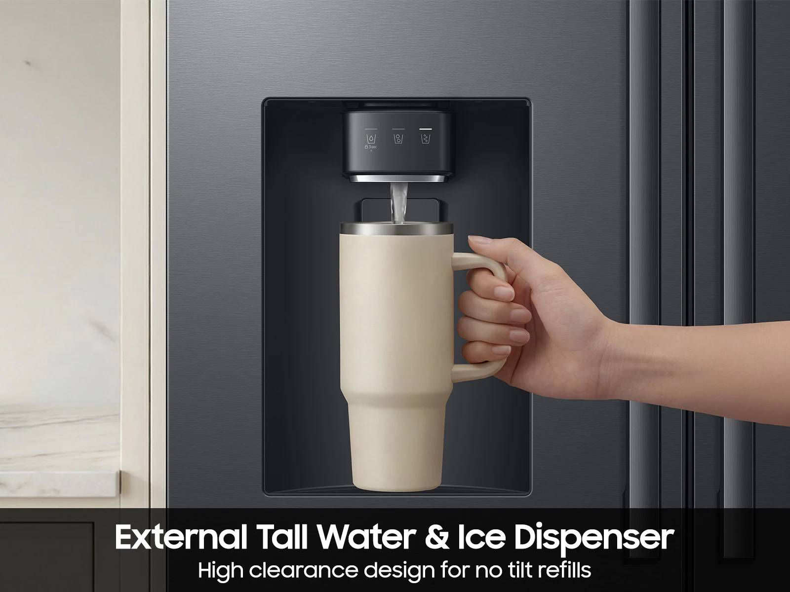 Get extra room to fill large bottles, pitchers and tumblers for easier, no-tilt refills - with ice always ready.