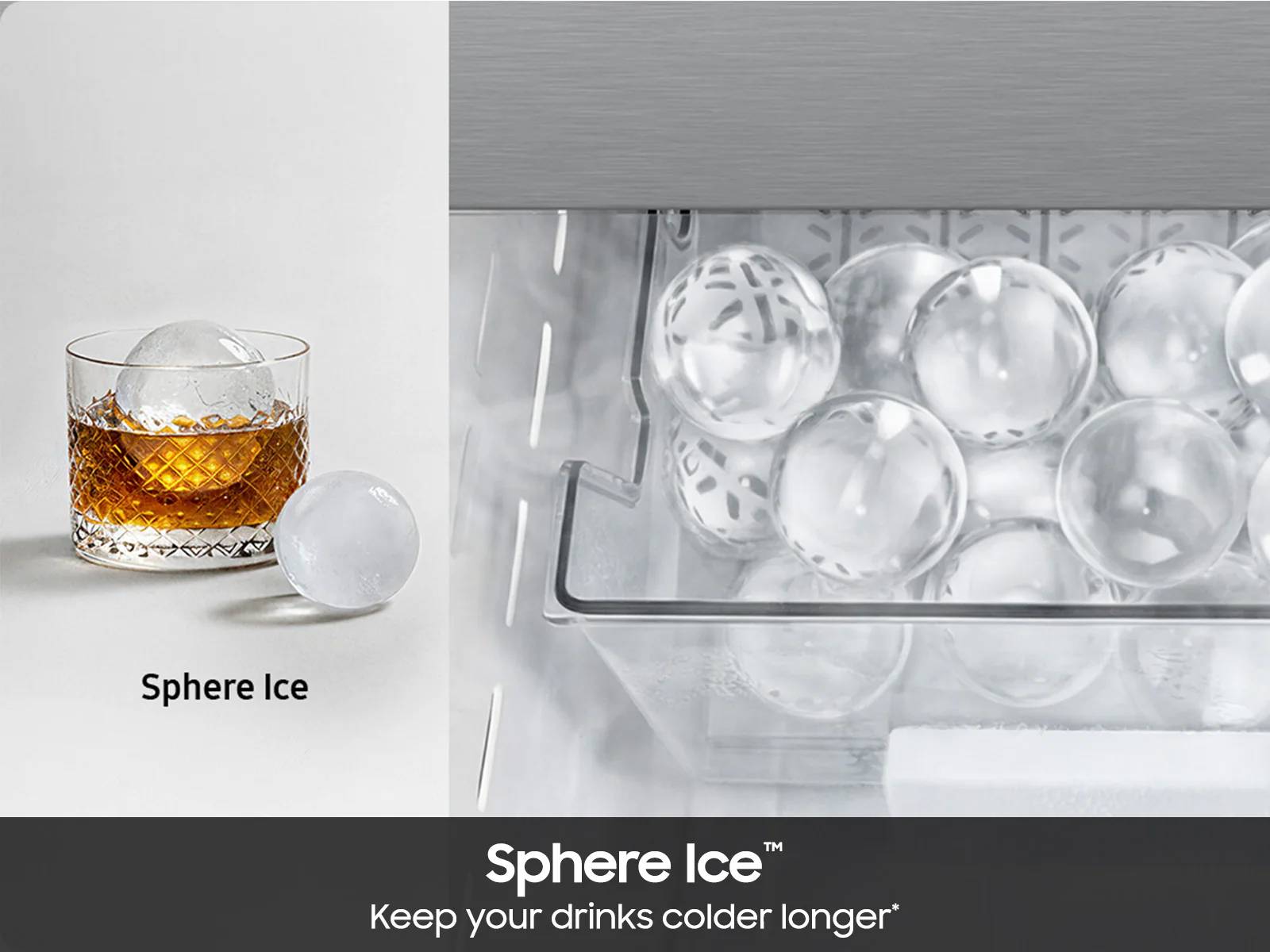 Enjoy your favorite beverage with up to four types of ice. Choose from Sphere Ice™ or Half Sphere Ice™ from the freezer drawer and curved or crushed ice from the external dispenser.