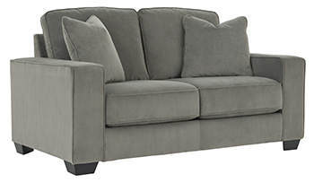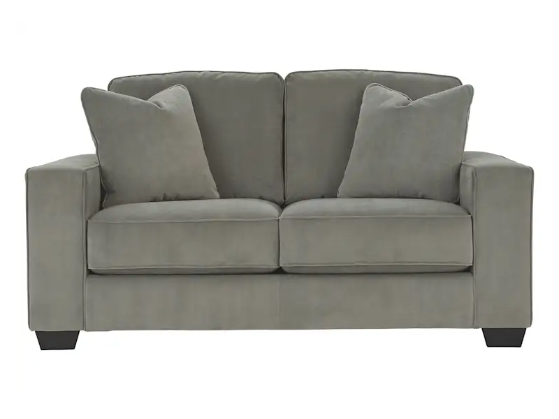 Serving up a refined, upscale look—at an incomparable value price—the Angleton loveseat lures from every angle. Crisp, 2-over-2 cushion design, wide track arms and black tapered feet lend a clean, contemporary aesthetic. Velvety soft upholstery in a chic sandstone gray upholstery takes neutral to another level. Matching feather-filled throw pillows master the art of minimalism.