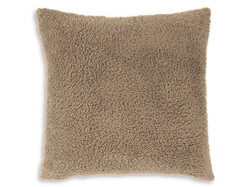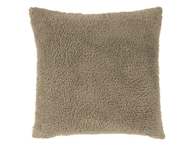 Sherpa in latte color. Solid reverse in tan. Knife edge construction. Polyester face with cotton reverse. Zipper closure. Fiber filled. Machine washable.