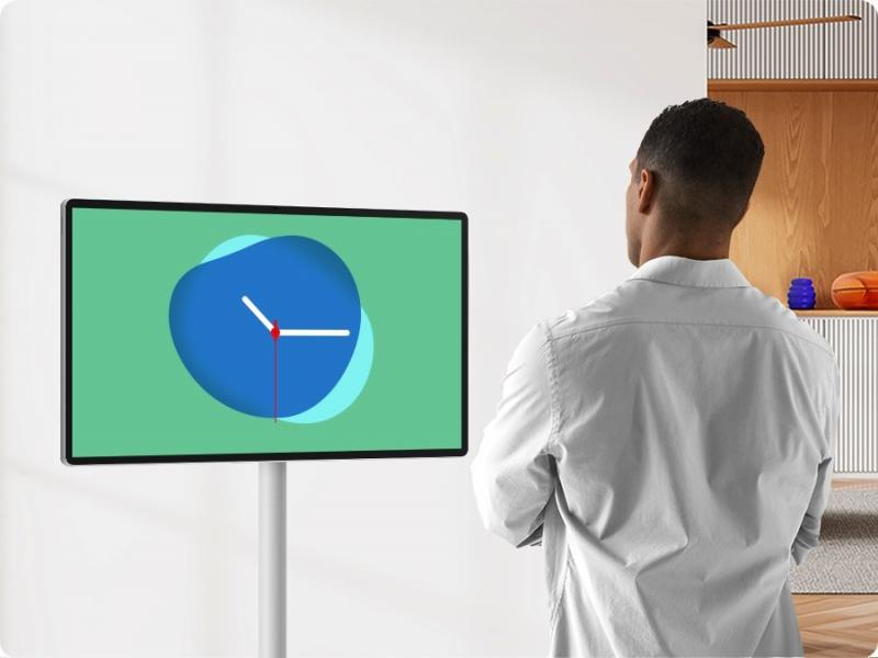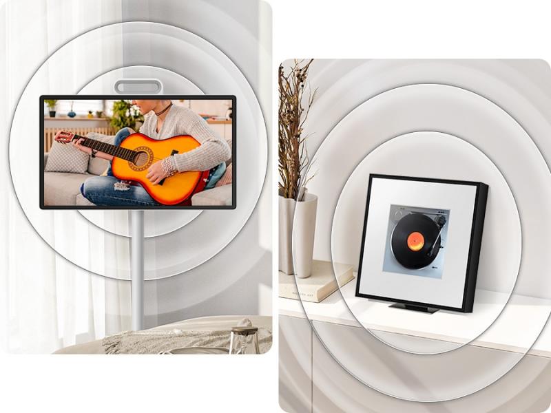 Designed with portability in mind, the Movingstyle offers effortless mobility and complete flexibility. Use it on the rollable floor stand to glide smoothly through your space, or detach it to place it in the spot of your choice. Its adjustable display delivers comfortable viewing, while its sleek design blends seamlessly into modern interiors.