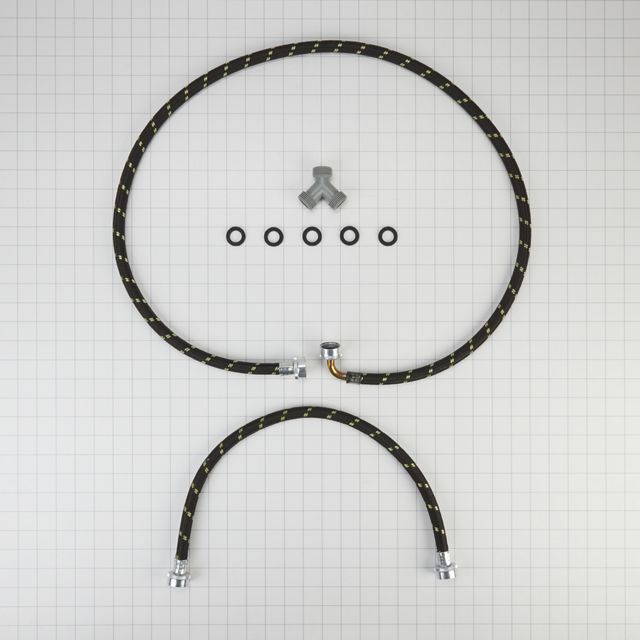 This Steam Dryer Hose Kit includes the hoses and adapters needed to replace your existing steam hose assembly. This kit includes (1) Y-connector, (1) 2' hose, (1) 5' hose and (5) rubber washers. The 90-deg elbow saves space and helps prevent kinking, while the braided polyester reinforced layer of the hoses adds strength and durability. This is an accessory that can be used across several steam dryer brands; check to see if your model number is compatible. Replacing this accessory will require basic hand tools, some disassembly of the appliance and novice repair experience. You must unplug the dryer or shut off the house circuit breaker for the appliance before installing this part. Also make sure you turn off the water supply to the dryer.