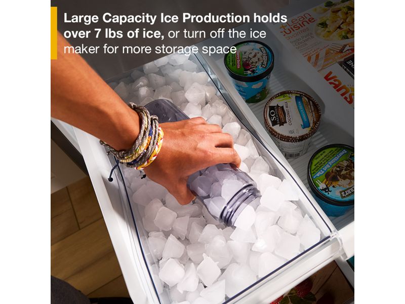Large Capacity Ice Production makes over 3 lbs of filtered ice every day to keep up with life's everyday demands, from filling coolers for the family to water bottles on your way out the door.
