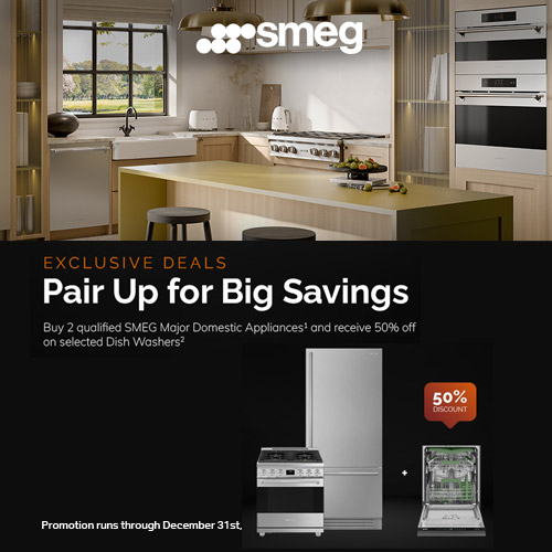 Buy 2 qualified SMEG major domestic appliances and receive 50% off on selected Dishwashers Offer valid through Dec 31st, 2025