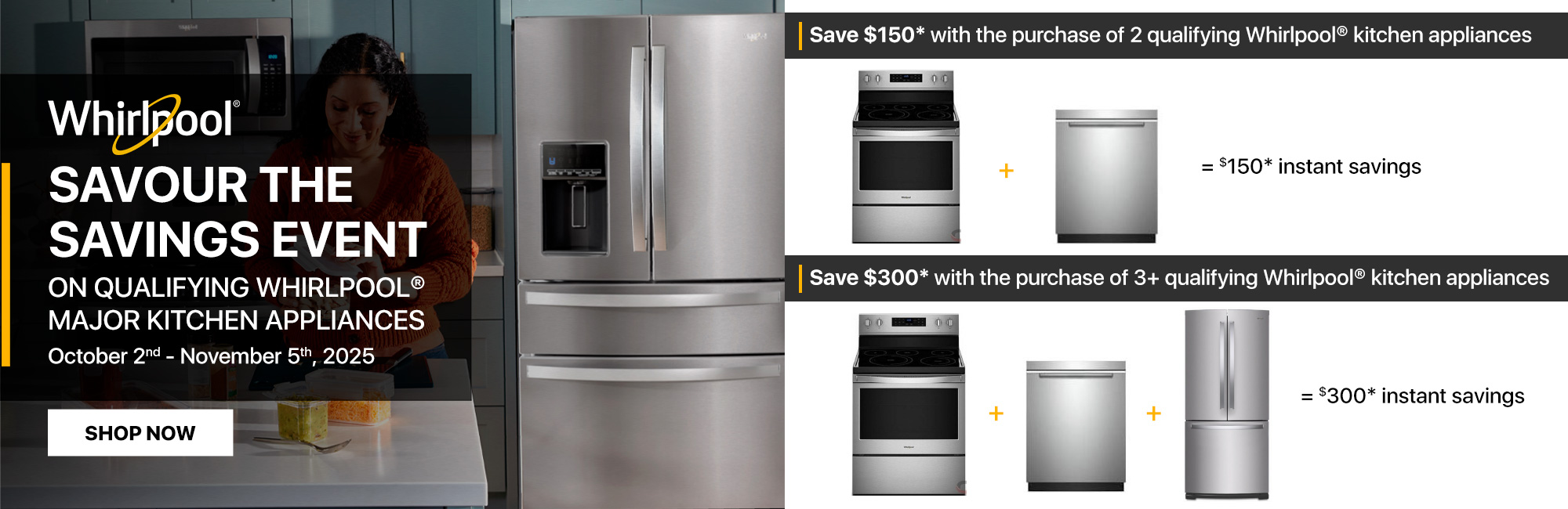 Save $150* with the purchase of 2 qualifying Whirlpool Kitchen appliances